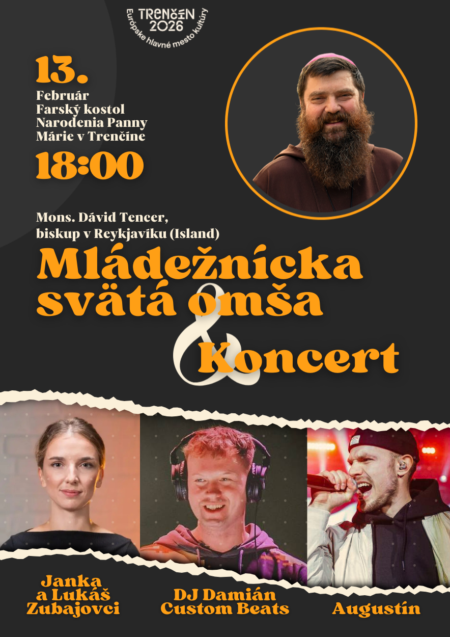 V rámci programu EHMK Trenčín 2026 vás pozývame 13. februára 2026 o 18:00 na Slávnostnú mládežnícku svätú omšu do Farského kostola Narodenia Panny Márie v Trenčíne. Hlavným celebrantom bude Mons. Dávid Tencer, biskup v Reykjavíku (Island).
