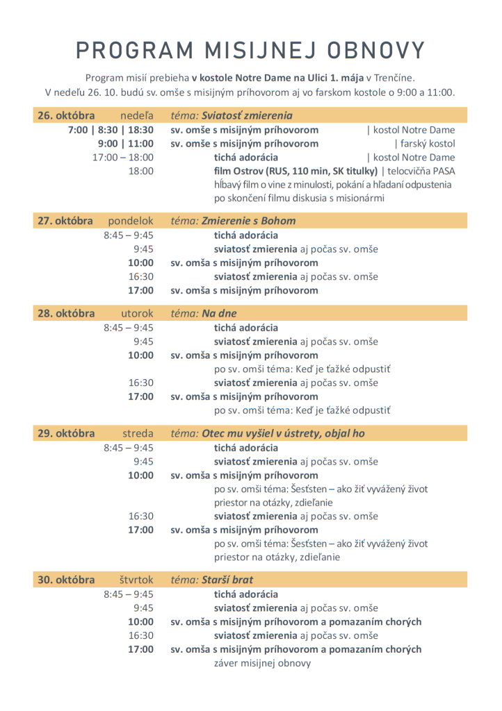Program sa uskutoční v dňoch 26. – 30. októbra 2025 v kostole Notre Dame na Ulici 1. mája v Trenčíne. Ste srdečne pozvaní!